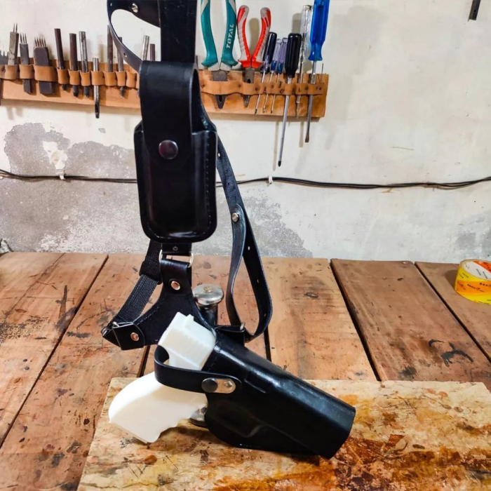 - 1 × Custom-molded leather chest holster body (open-muzzle + body shield)