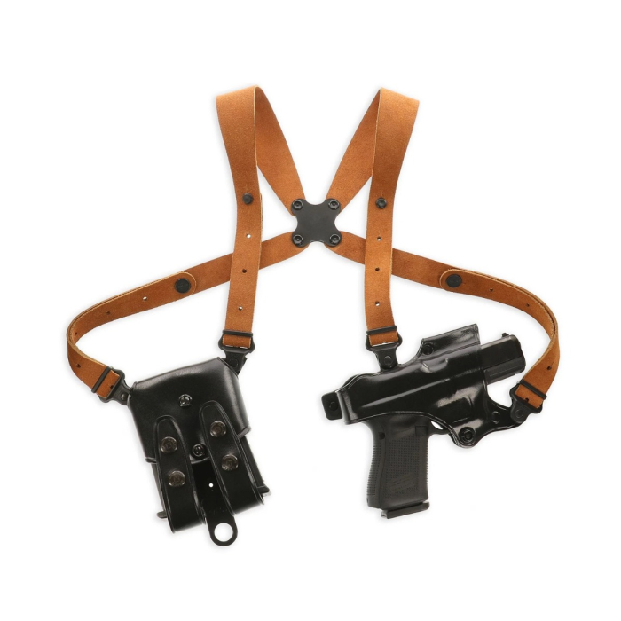 This shoulder holster is worn under the support arm and configured for left-hand draw. The diagonal orientation keeps the pistol secure against the body while allowing a smooth draw stroke. The leather harness includes a flexible backplate that allows natural movement and helps minimize shifting during daily activities.