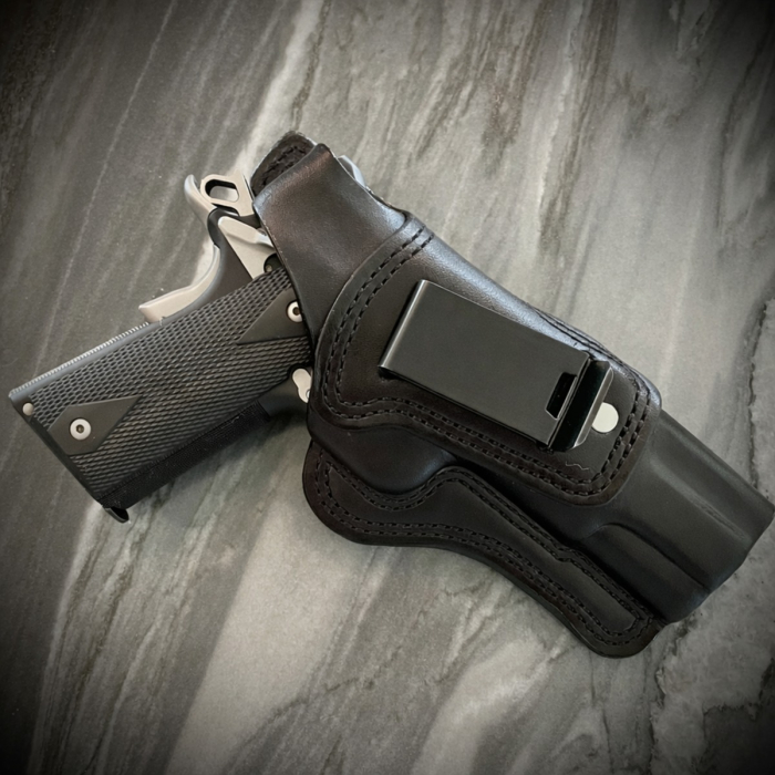 - Inside-the-waistband (IWB) leather holster design for concealed carry