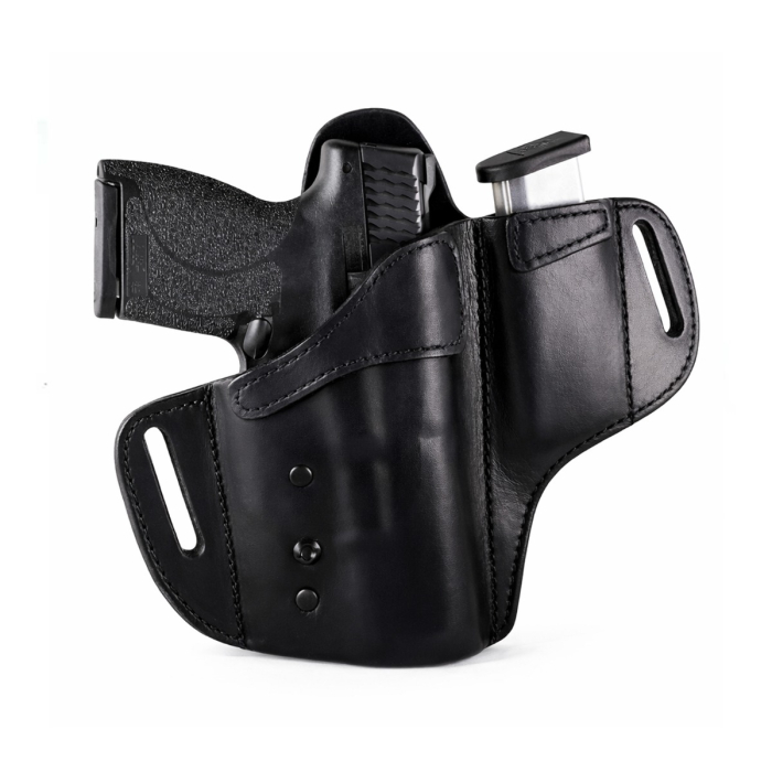 A proper OWB setup should anchor to the belt, maintain structure under stress, and allow a predictable draw every time. This black leather locking OWB holster with mag pouch is designed as a complete carry solution, combining firearm retention and spare magazine access into one coordinated system.
