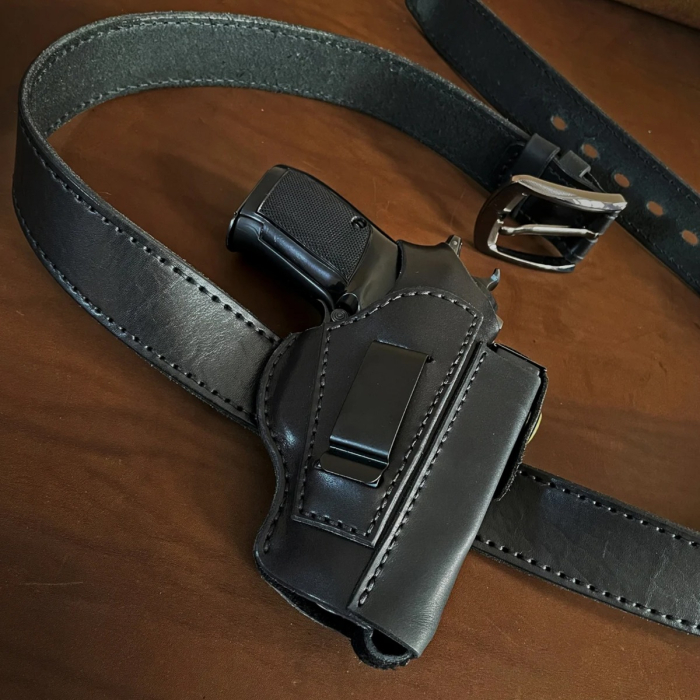 Handmade from leather panels stated by the maker to be approximately 2 mm and 1.4 mm thick, the holster is constructed to balance structure with flexibility. All seams are hand stitched, reinforcing areas that typically experience the most stress during draw and reholster cycles. This approach supports durability over time while maintaining the natural characteristics of leather.