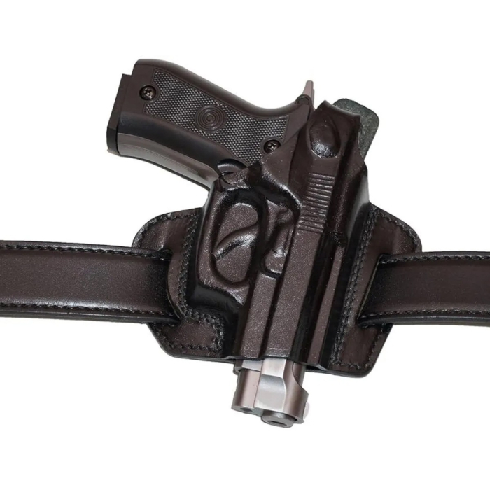 This black leather OWB pancake belt holster is built for users who want dependable retention, comfort, and stability in an open carry configuration. The pancake-style design uses dual belt slots to pull the holster inward against the body, helping minimize bulk while keeping the firearm securely positioned on the belt.