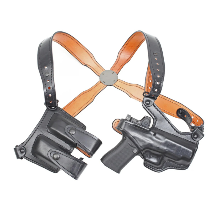 The harness distributes weight evenly across both shoulders using wide leather straps connected at the back by a reinforced junction plate. This balanced design helps reduce shoulder fatigue while keeping the rig stable during movement. Proper adjustment allows the holster to ride high enough for concealment while remaining accessible when seated or standing.