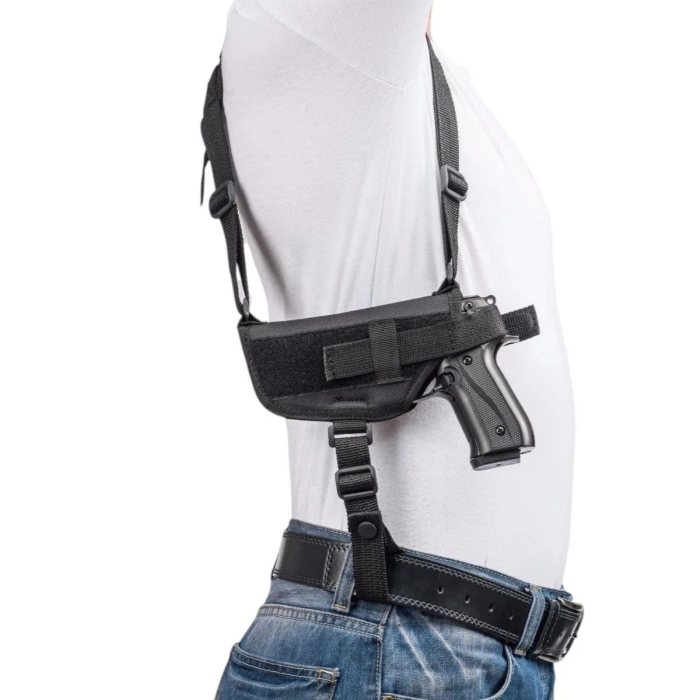 Hunters who spend long hours tracking or sitting in blinds often benefit from shoulder carry systems that remove pressure from the waist. A horizontal nylon shoulder holster provides stable access to a sidearm while remaining comfortable when worn over jackets or hunting gear.