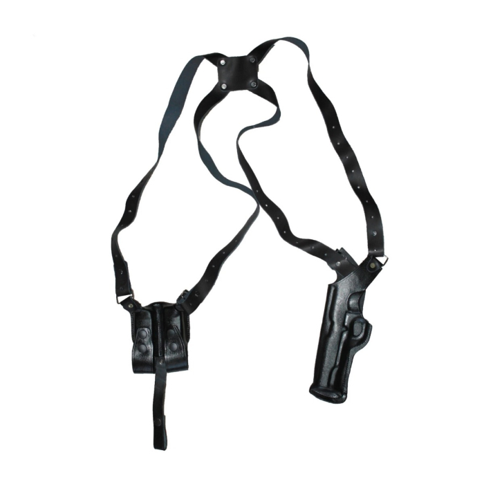 Black Real Leather Vertical Shoulder Holster with Double Magazine Pouch