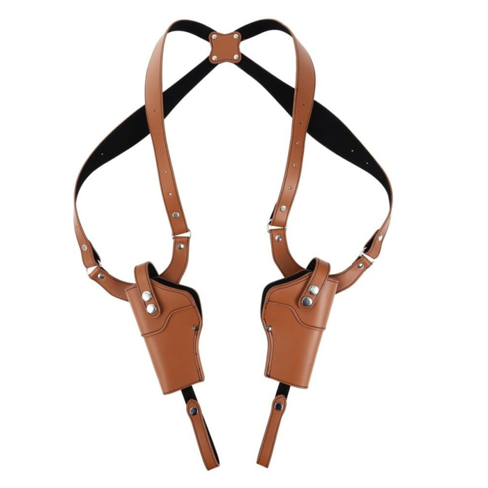 Some carry setups work best when the waistline is already crowded with other gear. That is where a shoulder rig makes practical sense. This brown dual shoulder holster uses a mirrored underarm layout with two holster bodies connected through an adjustable harness, giving the wearer a balanced carry system that rides across the shoulders rather than concentrating weight at one point on the belt. The seller listing describes it as a dual shoulder holster made from PU leather, with an adjustable back shoulder design and belt tie downs to help secure the rig during movement.