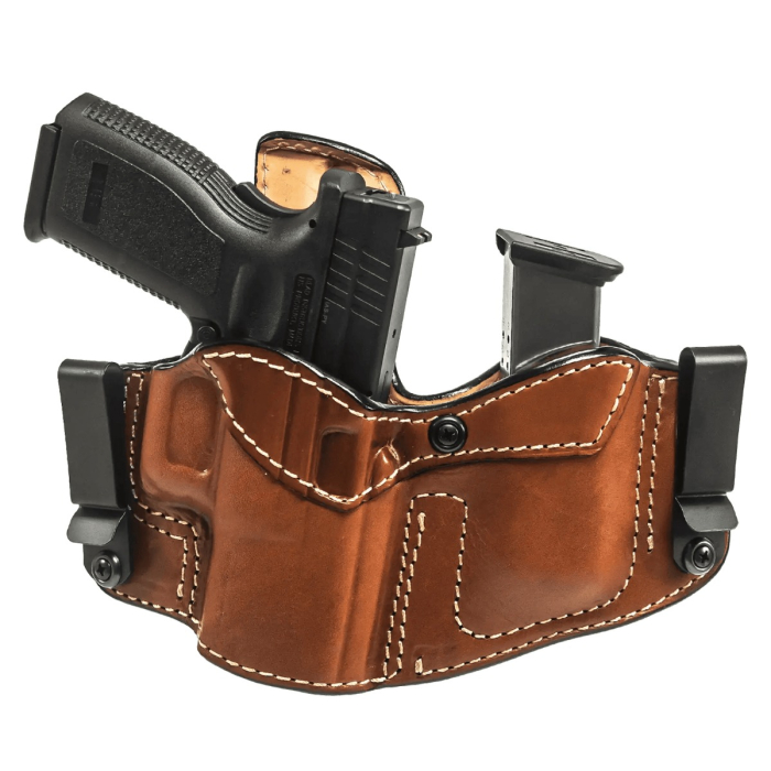 A reliable everyday holster needs to balance access, retention, and comfort. This brown leather dual-carry holster is designed to provide balance by supporting both inside-the-waistband and outside-the-waistband carry configurations. With its dual-clip design, the holster can be positioned securely along the belt line, allowing the user to maintain the same draw angle whether the firearm is concealed under clothing or worn openly on the belt.