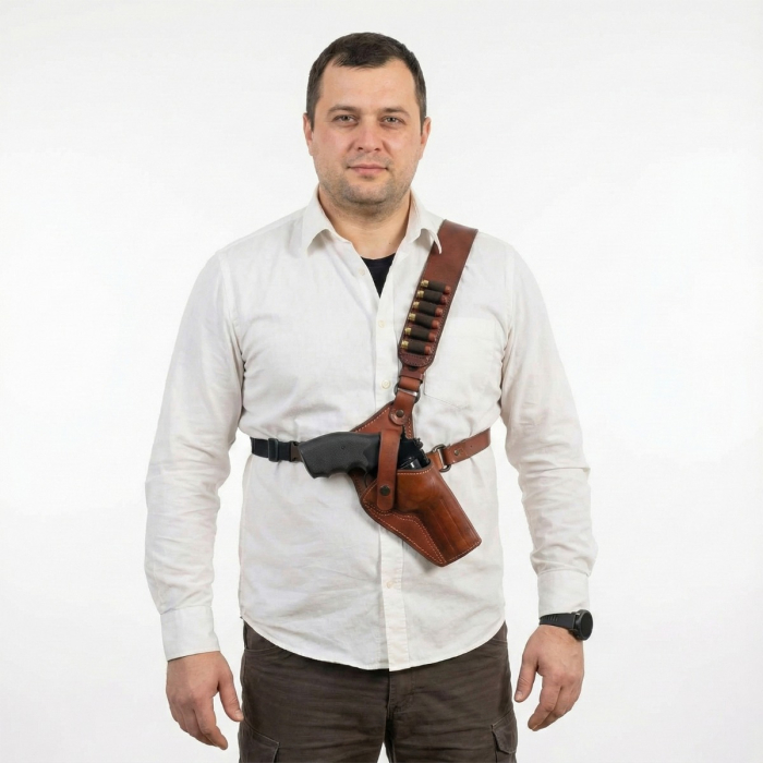The adjustable leather shoulder harness distributes weight across the upper body, helping reduce movement during walking or climbing. A forefinger retention strap secures the handgun in place while still allowing a controlled and natural draw. The hand-molded leather holster is shaped specifically to the selected firearm model, supporting proper fit and retention over time as the leather breaks in.