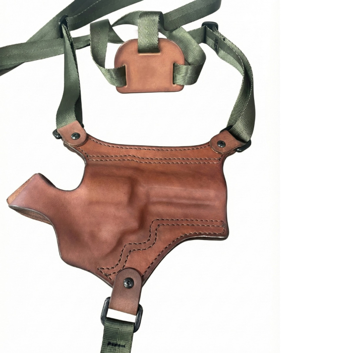 Brown Leather Revolver Chest Holster with Thumb Break Retention
