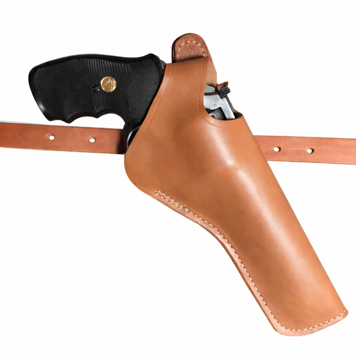 The holster is constructed from durable tanned leather designed to hold its form over time. The leather is intentionally firm when new and will naturally break in with regular use. The belt loop accommodates belts up to 1.5 inches wide, ensuring a secure fit on standard carry belts. Barrel length selection allows users to achieve proper coverage and balance based on their revolver size.