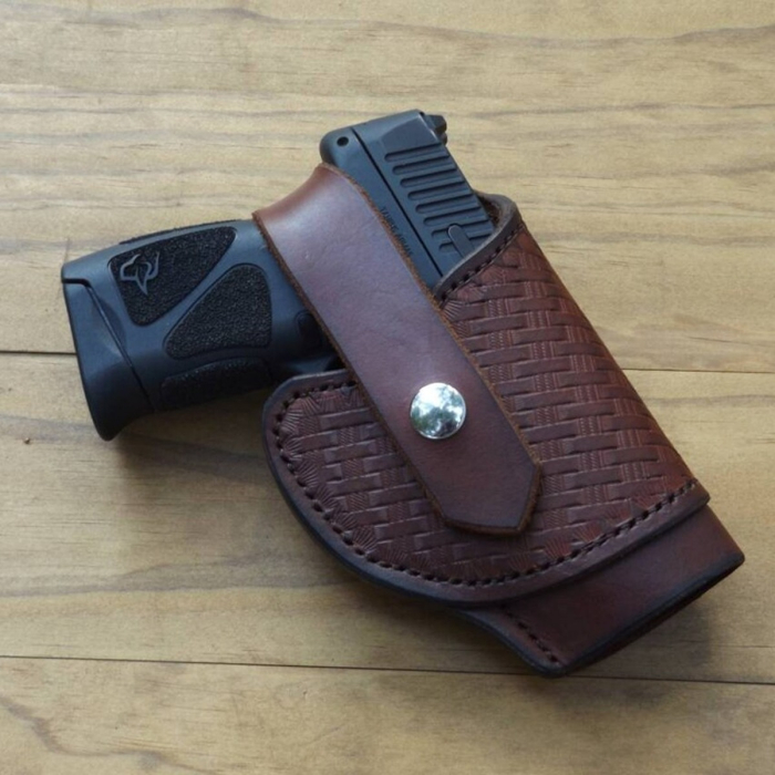 A good field holster should feel steady on the belt and give the user confidence when the day involves more movement than standing still. This design follows that idea with a compact OWB profile, a snap retention strap, and a shaped leather body that keeps the firearm supported without adding unnecessary bulk. In the listing photos, this version appears in the brown color option with a woven tooled front panel, dark edge finishing, and hand stitched seams that give it a classic working leather look.