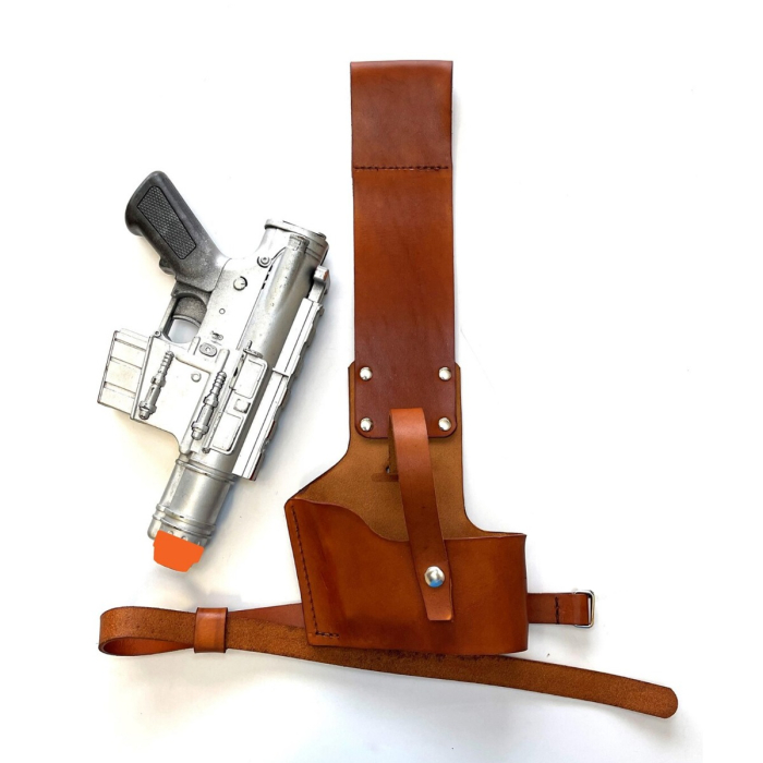 This brown leather blaster holster is designed for cosplay, costume wear, themed events, and character photoshoots. It suits users who want a screen inspired leg holster with a clean, practical looking profile.