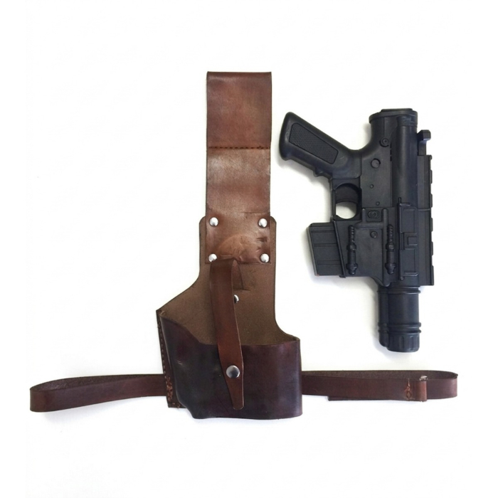 This dark brown leather blaster holster is designed for cosplay, costume wear, themed events, and character photoshoots. It suits users who want a more rugged and realistic looking leg holster.