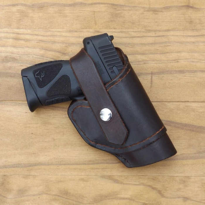 A field holster needs to do two things well. It needs to hold the firearm securely while the wearer is moving, and it needs to stay comfortable enough that the holster does not become the problem. This dark brown leather holster follows that approach with a classic outside the waistband belt design, a thumb break style retention strap, and a compact carry profile that keeps the holster close to the belt. The images show a smooth dark brown finish with lighter brown stitching, a silver snap, and a stitched belt loop section on the back.