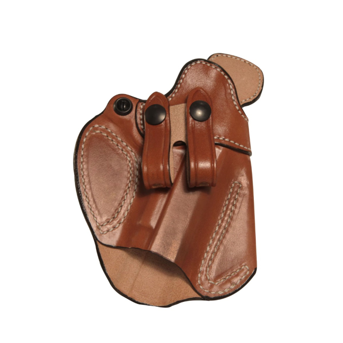 A well-made inside-the-waistband holster earns its place by doing the quiet jobs well. It has to ride close enough to disappear under a shirt or jacket, hold its position when the day gets active, and still give you a predictable draw when you reach for it. This reference design does that with a molded leather body, a tension device for retention tuning, and a reinforced memory band that helps the mouth keep its shape for deliberate one handed reholstering. Official product details describe it as a leather IWB design that must be worn with a belt, and the visible layout confirms the twin split loop arrangement that spreads support across the belt line rather than hanging all the weight from one point.