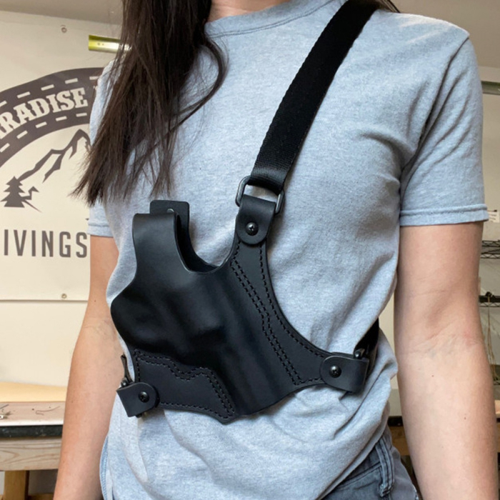 - 1 × Leather revolver chest holster with thumb-break retention strap