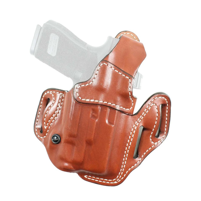 - Molded leather body for consistent firearm fit